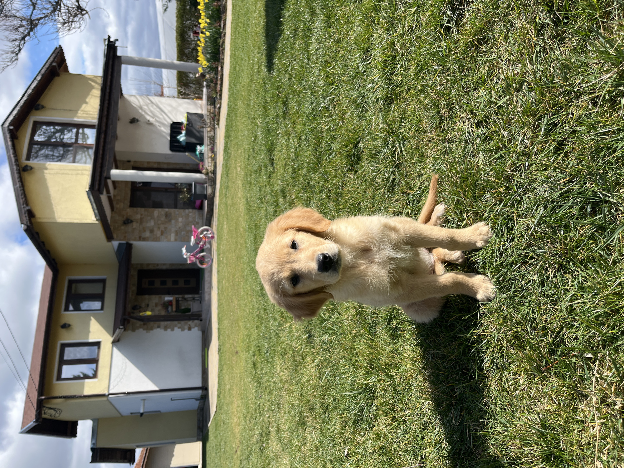 The image displays a domestic outdoor scene located in Kostinbrod, Bulgaria, observed under bright daylight with a partly cloudy sky. In the immediate foreground, a light golden-colored puppy, consistent with a Golden Retriever breed, sits centrally on a vibrant green lawn. The puppy is facing directly towards the viewer, exhibiting dark eyes and a black nose, with its ears softly flopped downwards. A distinct shadow from the puppy is cast to its left, indicating illumination from the right. The midground features a paved pathway leading towards a two-story residential house. This house presents a light yellow and white facade with a dark brown sloped roof, equipped with multiple dark-framed windows. A covered porch, supported by two prominent white columns, shelters the main entrance. Sections of the house's lower exterior walls are clad with stone. A small pink child's bicycle, complete with training wheels, is parked near the front entrance, slightly left of the house's center. To the right of the pathway, a flower bed is filled with numerous blooming yellow tulips. A dark storage container or bench is visible beneath the porch structure on the right side. In the background, a portion of another building is faintly visible to the far left. To the far right, beyond the house and a line of low green bushes, a large white structure, possibly a greenhouse or tent, is discernible. Bare tree branches are silhouetted against the sky on the extreme right.