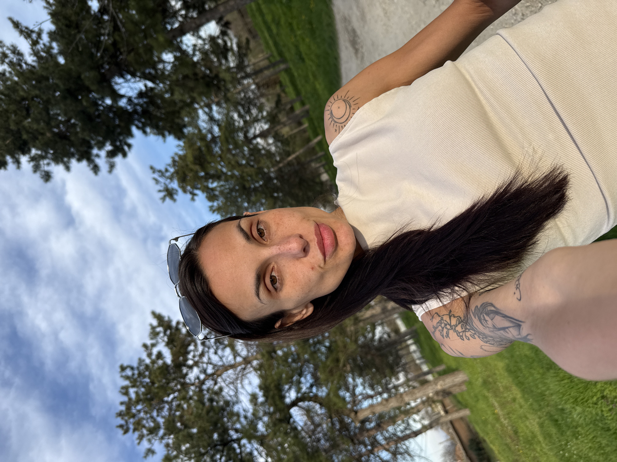 A woman is taking a selfie outdoors. She has dark hair and brown eyes, and her sunglasses are perched on her head. She is wearing a light-colored top, and tattoos are visible on her upper arms and shoulder. The background includes trees and a cloudy blue sky. The location is likely a park or green space, potentially in Obnova, Bulgaria.
