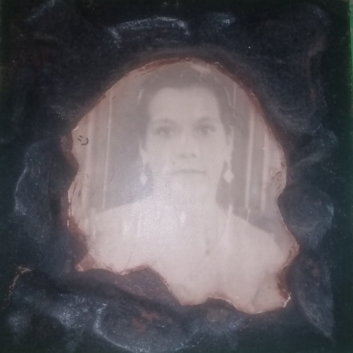 A sepia-toned photograph of a woman with dark hair and light skin is centered in a textured, dark frame. The frame has an irregular, organic shape with rough edges. The woman is wearing earrings and a light-colored garment, possibly a dress or blouse, with a subtle necklace. The background behind her appears to be a wall with vertical lines. The photograph has faded and shows signs of age.