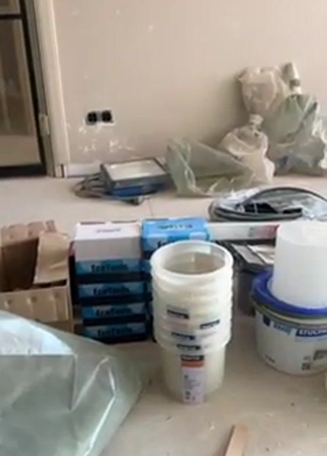 cluttered construction site. Several open buckets of paint and supplies are scattered on a light colored floor. A box of EcoTools is stacked on top of other supplies. There are some trash bags. A work light and power cord sits in the background, against a wall with an electrical outlet. A door is partially visible. A stack of objects on a shelf includes more containers. A window is visible in the background. A stepladder is partially visible.