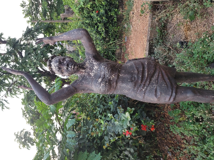 A weathered, dark-colored statue of a person with arms raised stands amidst lush greenery