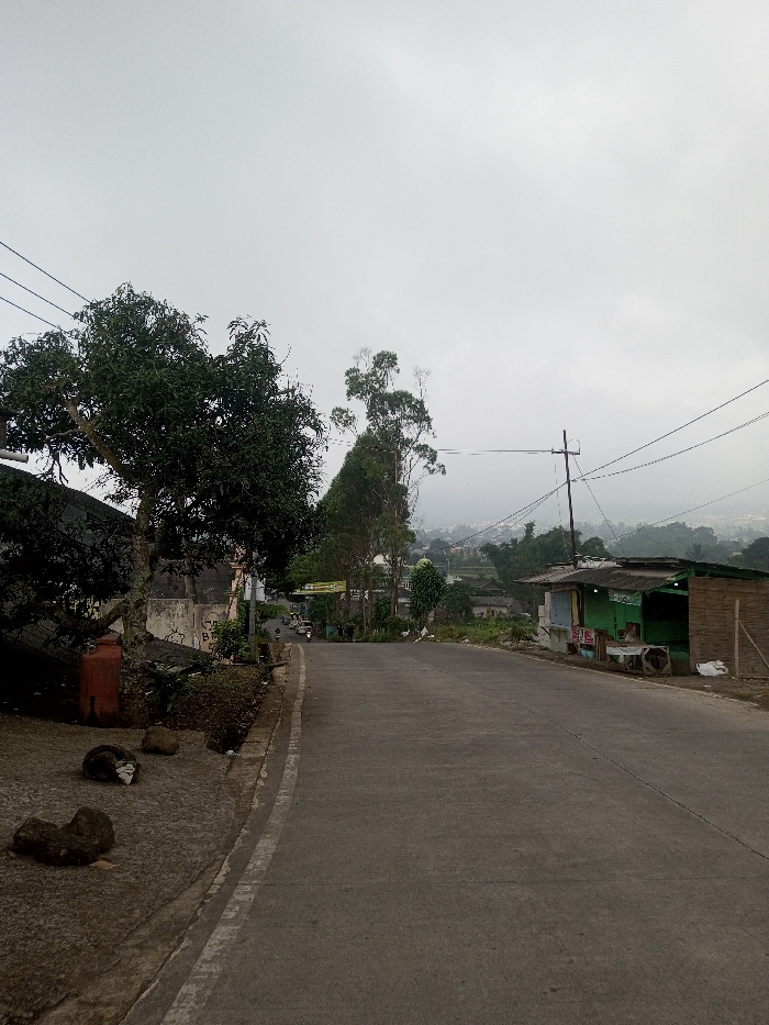 This image presents an overcast street scene in Nuwara Eliya, Sri Lanka, captured from a low vantage point looking uphill. The sky is uniformly light grey with heavy cloud cover. The foreground on the left features a concrete sidewalk section with three dark, irregularly shaped rocks. A reddish-brown cylindrical metal object rests near the base of a large tree with dense, dark green foliage, whose trunk is angled upwards to the left. Behind this tree, a light-colored wall with faint graffiti is visible. Overhead utility wires traverse the upper left corner of the frame. The asphalt road, appearing somewhat aged, gently ascends and curves slightly to the right. A faded white line delineates its left edge. In the midground, further along the road, a prominent yellow archway or sign spans the road. Beneath this archway, several indistinct figures, likely on motorcycles or small vehicles, are observed. On the right side of the road, a small, weathered structure, predominantly green with sections of brown wooden paneling, stands on a dirt shoulder. This structure, resembling a small shop or dwelling, features an awning and an adjacent wooden fence-like barrier to its right. A utility pole with crossarms and multiple overhead wires is positioned behind this structure, extending across the upper right section of the image. The background displays distant hills and scattered urban development, partially obscured by atmospheric haze or fog, consistent with the overcast conditions. Various trees and dense foliage contribute to the semi-rural aesthetic beyond the immediate road environment. No discernible direct interactions between people are visible.