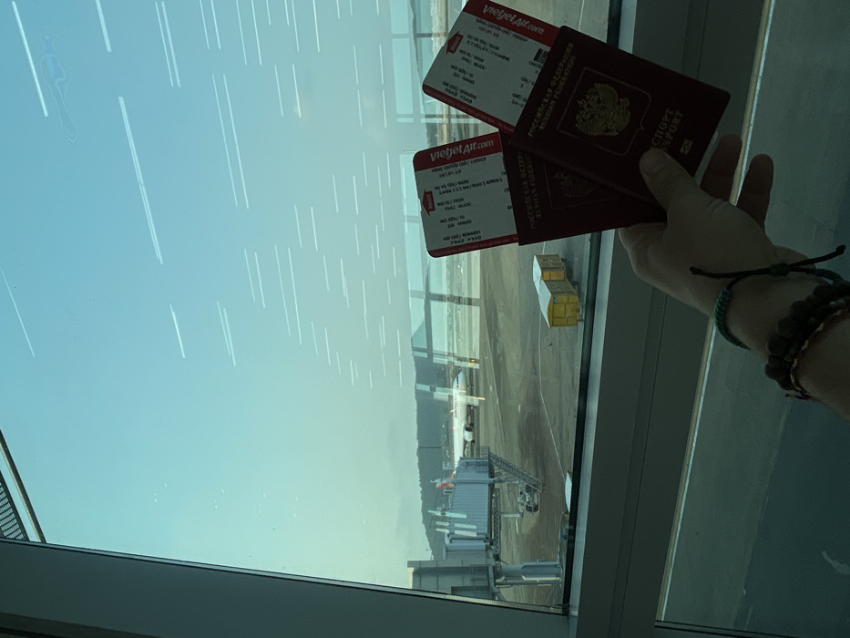 A first-person perspective image captures a view from an airport terminal window overlooking the tarmac at Phú Quốc International Airport in Phú Quốc, Vietnam. In the foreground, a light-skinned human hand, adorned with multiple dark beaded and woven bracelets, is prominently positioned in the lower right quadrant, holding two dark red Russian Federation passports. Two red and white Vietjet Air boarding passes are partially visible, tucked into the passports. Beyond the window, the paved airport tarmac is visible under ambient daylight. A light grey jet bridge stands in the mid-left, connected to an unseen gate. Further back on the tarmac, a white passenger aircraft with a distinct red tail marking is positioned, either parked or taxiing. To the right of the jet bridge, two yellow cargo containers are present on the tarmac. The background features a low horizon line with distant, dark green hills or mountains under a hazy, pale blue to light cyan sky. Reflections from the interior of the airport terminal are visible on the windowpane.