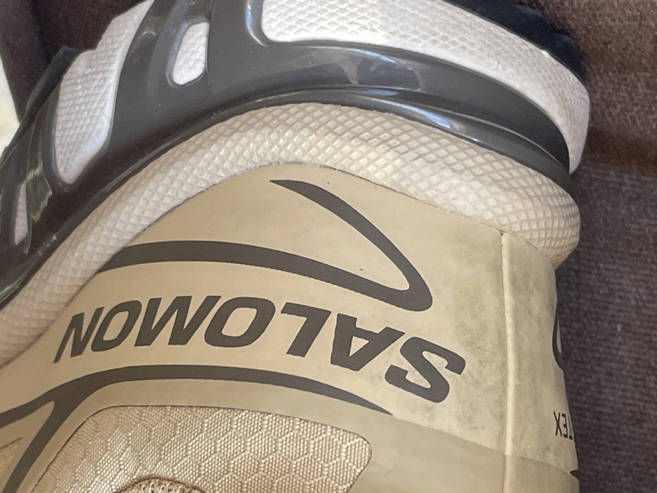 A close-up of a beige Salomon shoe features a large, inverted dark grey "SALOMON" logo. The shoe's upper portion is a textured, white material with a grey trim. The sole is a similar beige, and a "GORE-TEX" label is visible near the back of the shoe. The background is a blurred, dark brown surface.