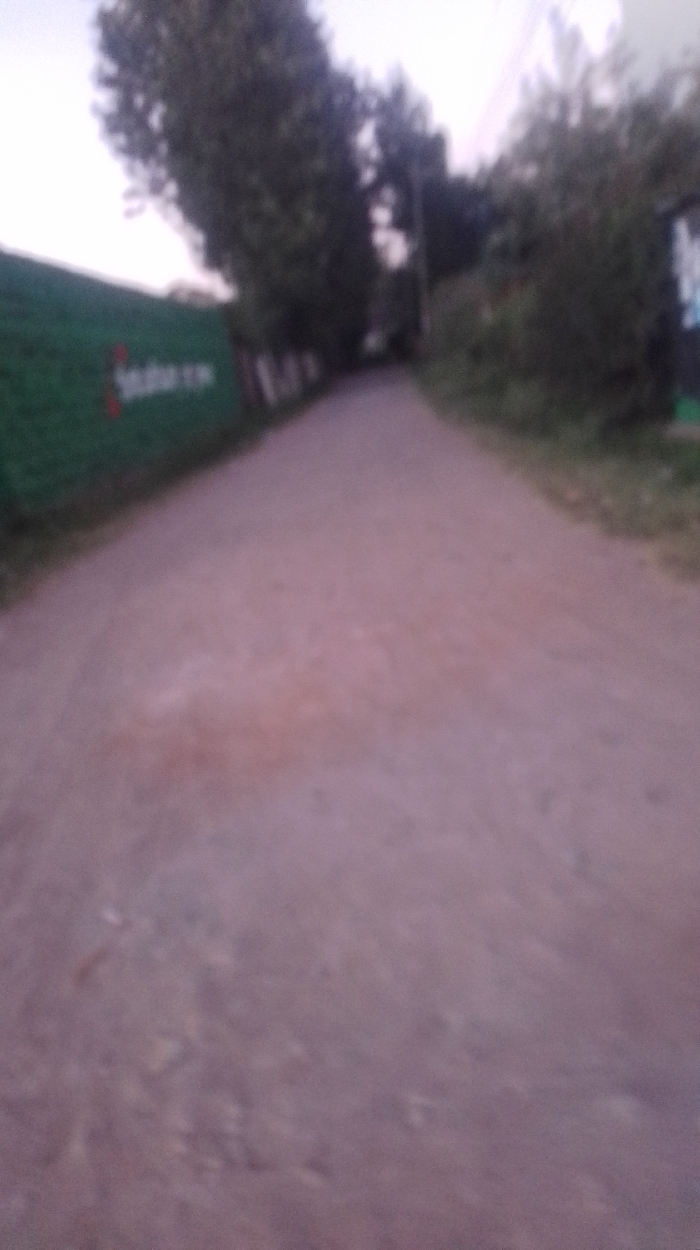 A blurry, ground-level perspective of a dirt road stretching into the distance. The road is flanked by trees and greenery on both sides. A green barrier with red and white lettering is visible on the left. The image lacks sharpness and detail, making it difficult to discern specific features beyond the basic composition. The overall scene appears to be captured in dim or fading light.