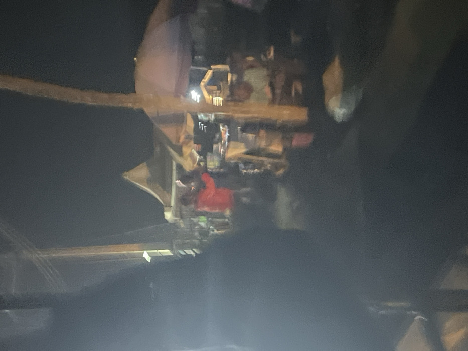 An indistinct image, seemingly captured at night, showcases a structure elevated on supports. It appears to be either a building or a platform. On the structure, several objects are visible, including what might be a red bag or container. The upper section of the structure appears to have multiple people standing on it, though their details are unclear due to the lighting. The foreground of the image is dark.