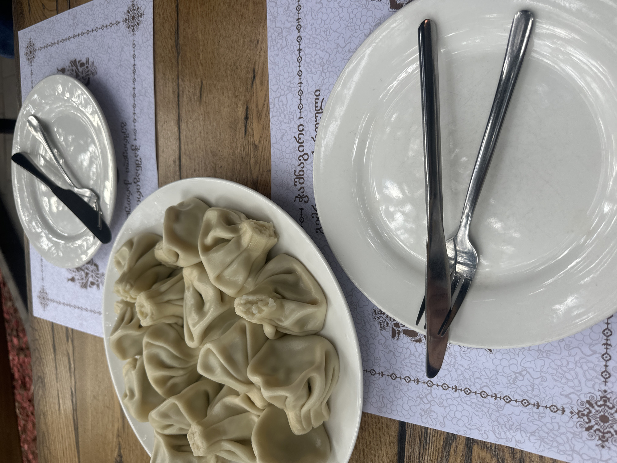 The image captures a table setting with Georgian dumplings, known as Khinkali, as the central focus. The dumplings are presented on a white plate, densely packed together, suggesting a generous serving. To the right of the dumplings is a larger, also white, plate with a fork and knife laid across it. To the left, there's a smaller plate with cutlery. Each plate sits on a paper placemat, printed with grapes and Georgian writing. The table itself is made of wood, with visible grain. The overall setting is indoors, likely a restaurant in Tbilisi, Georgia, given the traditional Georgian dish and script on the placemat. No people are visible in the frame. The scene suggests a meal setting.