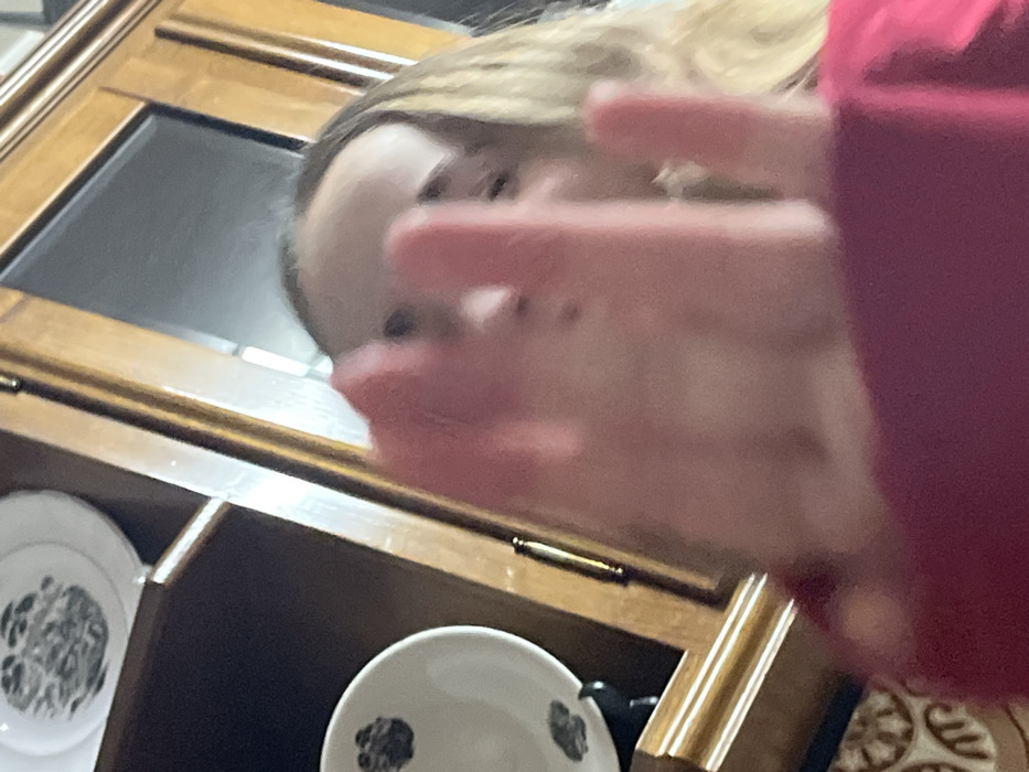 An upward-angled, close-up photograph depicts an indoor scene with a person and background furniture. The foreground is dominated by a person's hand, held up and obscuring most of their face, which is visible but heavily blurred in the upper-mid frame. The person has light-colored hair and is wearing a red top. In the background, to the left, a wooden display cabinet or hutch is visible. Two shelves are present, holding white ceramic dishes; the upper shelf contains a plate with a dark, intricate pattern, and the lower shelf holds a bowl with a dark, possibly paw-print design, positioned on a dark stand. The cabinet features polished wooden frames and a visible gold-toned hinge on a door. A patterned floor or textile, light brown and off-white, is partially visible at the bottom left. The specific location within Macedo de Cavaleiros, Portugal, cannot be determined from the visual evidence provided.