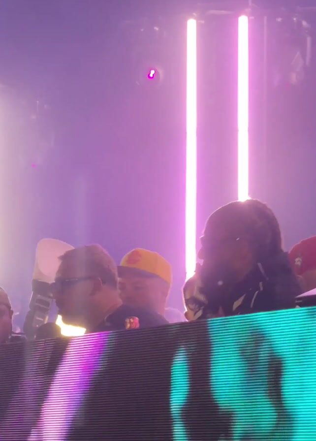 group of people standing behind a large digital display screen, likely at a concert or performance venue. The people in the foreground are likely crew members or possibly the performing artists. A hand is visible operating a professional camera with a light attached. The scene is lit with pink and white stage lights creating a vibrant and energetic atmosphere.