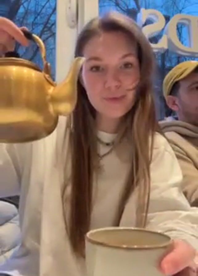 A young woman is pouring tea from a gold-colored teapot into a light-colored ceramic mug. She is wearing a white sweater and a necklace with a star pendant, and has long brown hair. She looks directly at the camera a few times. A man in a beige sweater and yellow cap is visible in the background, partially obscured. The setting appears to be a cafe, with a window showing a street scene visible behind the woman. The window also reveals a partial sign of the restaurant's name.
