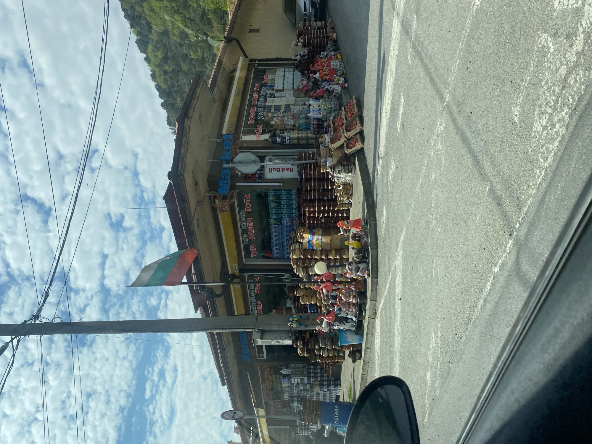 street view in Kresna, Bulgaria, with a shop prominently displayed on the side. The shop, named "Market," is adorned with a Bulgarian flag and several signs advertising various products like beer, wine, and food items. A variety of goods are displayed outside the shop on the sidewalk, including stacks of pottery, figurines, and crates of tomatoes. The street is visible, and a mountain can be seen in the background. Part of a vehicle's interior is visible at the bottom, indicating the picture was taken from inside a car.