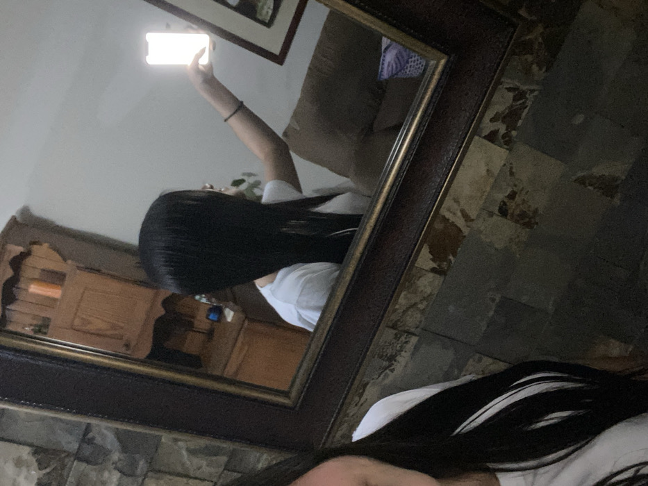 The image displays an indoor scene in Cotoperíz, Venezuela. The central subject is a mirror reflection of an individual taking a photograph. The reflected person, characterized by long, dark, straight hair and a white short-sleeved top, is holding a brightly illuminated smartphone in their right hand, extended towards the mirror, actively capturing the reflection. A thin, dark bracelet is visible on their right wrist. In the immediate foreground, a partial view of another individual, presumably the one operating the camera, is visible on the left, showing dark hair, a white top, and a portion of their lower face. The mirror itself is large and rectangular, framed with a dark brown outer border and a thinner, gold-colored inner trim. Within the mirror's reflection, a dark wooden cabinet or hutch, containing various indistinct items including a potential orange cylindrical object and a blue object, is visible in the upper left quadrant. A brown upholstered sofa or armchair, upon which a purple and white patterned item rests, is reflected in the lower right. A framed picture with a dark border is partially visible on the wall to the right of the reflected person. The wall directly surrounding the mirror in the foreground features a textured facade composed of irregularly shaped, multi-toned stone or tile blocks in shades of grey, brown, and tan. The ambient lighting of the room is subdued, with the illuminated smartphone screen serving as a primary light source within the reflection.