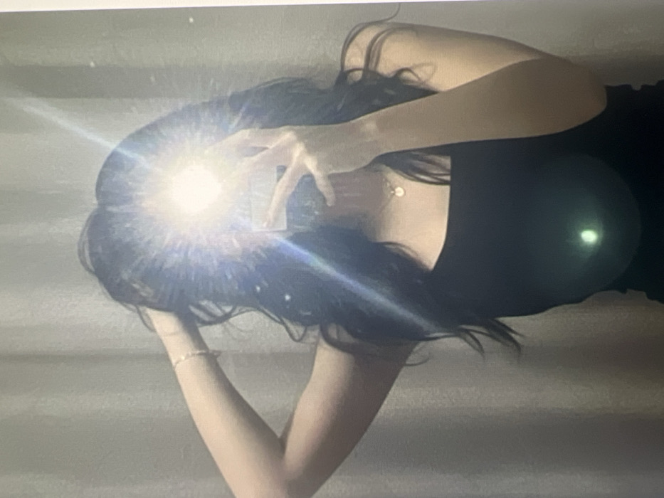 This image, taken in Ittenheim, France, captures a single individual performing a mirror self-portrait. The subject, exhibiting long, dark, wavy hair, is partially obscured by a bright photographic flash emanating from a handheld smartphone. The individual wears a black tank top, a gold-colored chain necklace with a circular pendant, and a thin gold-colored bracelet on the left wrist. The right hand holds the illuminating smartphone, while the left arm is raised with the hand near the hair. The background consists of a light-toned, vertically-folded curtain or textile. A distinct green lens flare is visible in the lower central area of the frame.