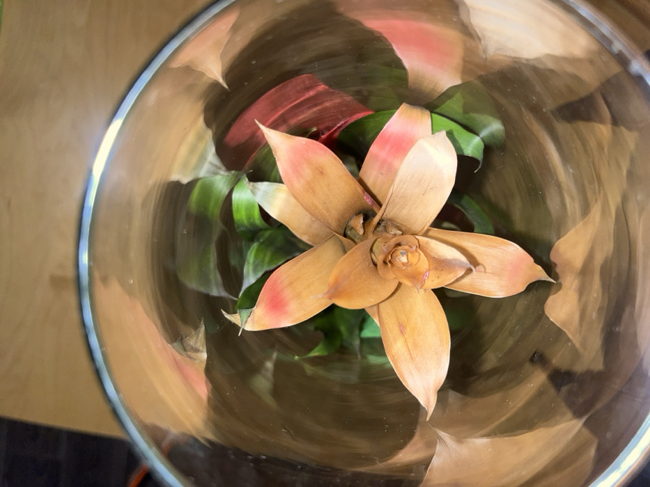- "An overhead view depicts a bromeliad plant contained within a clear glass vessel, located in the city of Le Puy-en-Velay, France" by FM-UzABM2, licensed under CC BY 4.0