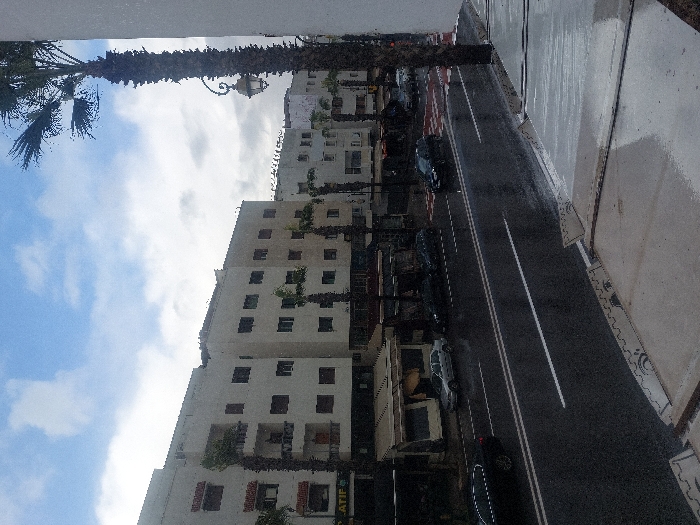 The image displays an urban street scene in Rabat, Morocco, viewed from a slightly elevated perspective. The sky above is partly cloudy, with patches of blue visible amidst white and grey clouds. The asphalt roadway below appears wet, indicating recent precipitation, and features two clearly marked lanes separated by white double solid lines and a single white dashed line. Several dark-colored vehicles are present on the street, some parked along the curb and others positioned on the roadway. On the left side of the street, a continuous row of multi-story, light-colored buildings with flat roofs extends into the distance. These buildings feature multiple rectangular windows, many equipped with brown or dark-colored shutters. The ground floors house various commercial establishments, some with beige retractable awnings extended. Partial signage, including the text "ATIF," is discernible on one storefront. Tall palm trees with prominent trunks line the street between the buildings and the roadway. In the immediate foreground on the right, a large palm tree stands vertically, its trunk adorned with a vintage-style streetlamp featuring an ornate bracket. This tree is adjacent to a stark white vertical wall that defines the right edge of the image frame. The foreground also includes a wet, light-grey horizontal surface, possibly a balcony or rooftop, exhibiting patterned decorative edging and reflecting the sky. No human figures are visible within the frame.