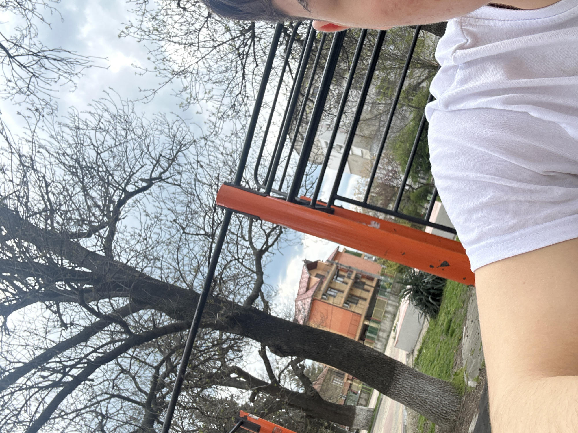 A slightly angled upward shot reveals a person in a white t-shirt, presumably taking a selfie at an outdoor fitness park in Karnobat, Bulgaria. The person's face is partially visible at the top edge of the image. In the background are outdoor exercise equipment, specifically parallel bars with orange and black metal frames. Bare tree branches are visible in the top left of the frame, set against a cloudy sky. Further in the background, a multi-story building with a red roof and beige walls can be seen, along with a patch of green grass. The image appears to be taken during the daytime in an outdoor setting.
