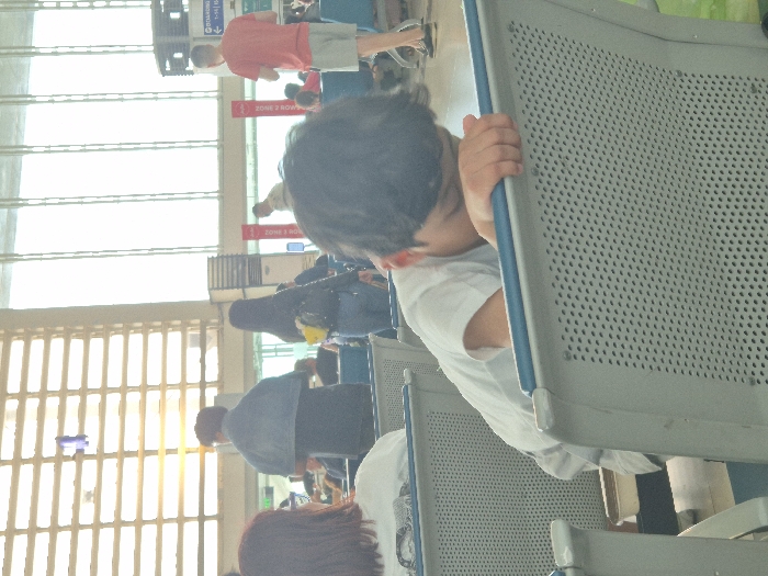 A crowded airport gate scene. A child in a white shirt clings to a grey metal chair, likely waiting to board. Various seated people and luggage surround the child. Further back, a man in a red shirt and shorts stands by signage. Large windows let in bright light. The overall setting suggests a busy travel environment.