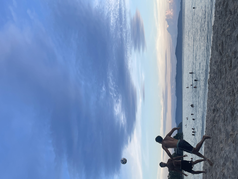 The image depicts a twilight scene on a sandy beach in Baan Sri Thanu, Thailand, with a body of water extending to a distant landmass of hills under a partially cloudy sky. In the foreground, two shirtless adult males are playing soccer on light-colored sand. The man on the right, viewed from behind, is airborne with his right leg extended upwards, appearing to kick a black and white soccer ball suspended in the air to his left. He wears dark, patterned swim shorts. The man on the left, facing right, stands with his torso angled towards the soccer player, wearing dark, solid swim shorts. In the midground, the calm water contains approximately 15-20 individuals, mostly visible from the shoulders up, swimming or wading. The background features a range of hills across the water, silhouetted against the sky, which transitions from pale pink and light blue at the horizon to darker blues and grays overhead, filled with scattered cloud formations of varying densities.