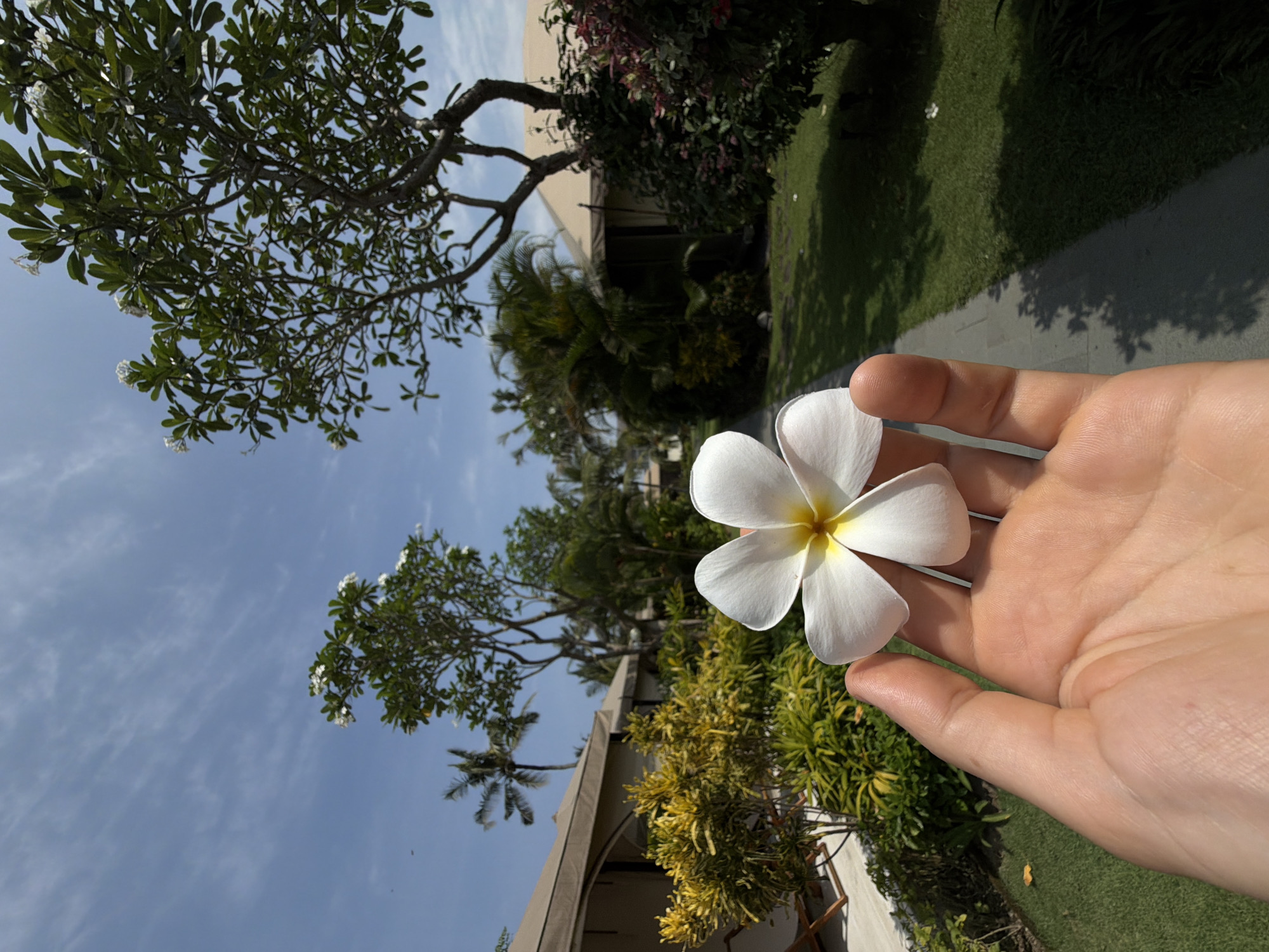 The image, captured in Belalang, Indonesia, presents an outdoor scene under a clear blue sky with sparse cirrus clouds. A fair-skinned human hand, positioned centrally in the foreground, holds a single white plumeria flower with five petals and a yellow center. In the midground and background, an organized resort-like environment is visible. To the left, two light-colored, rounded-roof tent structures, consistent with accommodation units, are present. Adjacent to the nearest structure, two wooden lounge chairs with white cushions are placed on a light-toned patio. Lush garden beds containing various green and yellow-leafed shrubs flank these structures. A light gray paved walkway extends from the midground into the distance on the right, bordered by manicured green grass lawns. Several tropical trees punctuate the landscape, including a prominent plumeria tree with white blossoms and dark green foliage, casting shadows across the path, and a tall palm tree visible further back on the left. Other dense tropical vegetation and partially obscured structures are scattered throughout the background. The scene is brightly illuminated by natural daylight, suggesting midday conditions.