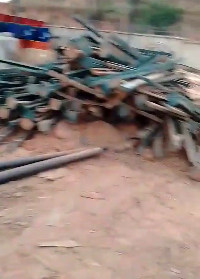dusty outdoor scene, possibly a construction or industrial site. In the foreground, there are several long, black pipes on the ground. As the camera moves, a pile of metal scaffolding or framework comes into view. The pieces are painted with a turquoise or green color and are scattered haphazardly. Behind the metal pieces, there is a pile of what appears to be rebar, stacked in a coil. The background includes a concrete wall and a sloping hill covered with sparse vegetation. The scene is partially covered by a roof or awning. The video has the logo "itel P40 4G" in the lower left corner.