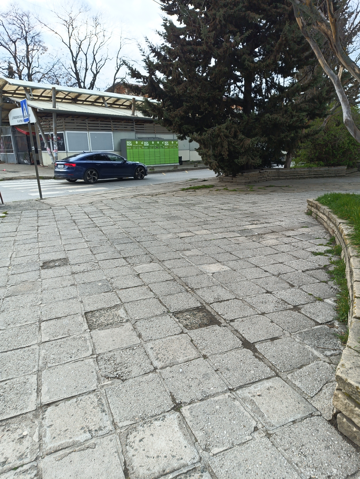 public area in Karnobat, Bulgaria. The foreground features a paved pedestrian area with square concrete tiles, some of which are cracked or missing. A low stone wall with grass growing along its edge is on the right. A dark blue Audi car is visible in the midground, driving past a building with a covered walkway and several green "Box Now" parcel lockers. A pedestrian crossing sign is visible on the left side of the road. Several trees are in the background. The sky is overcast.