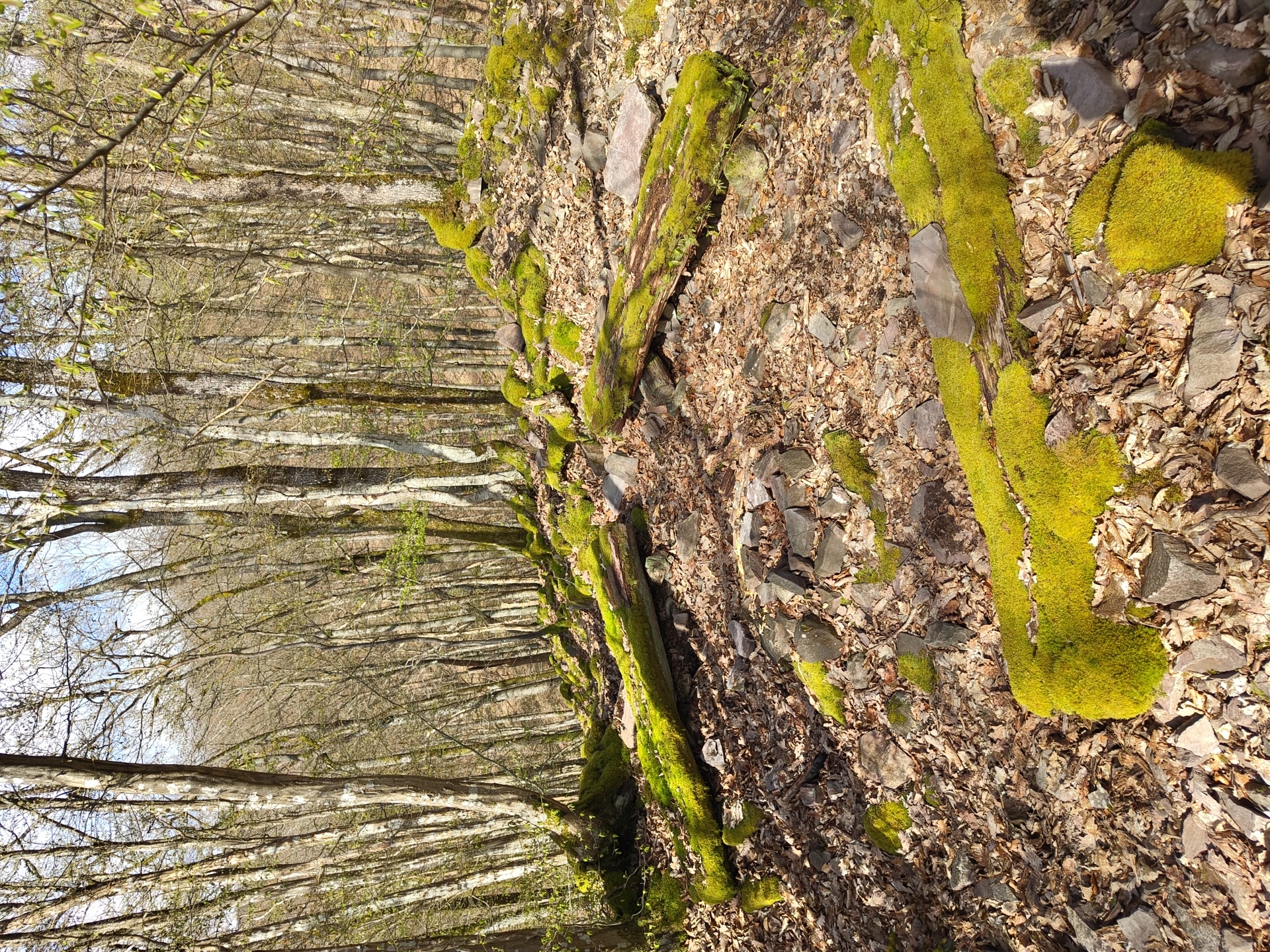 forest floor in Mettlach, Germany, covered in dead leaves and rocks. Moss grows on fallen tree trunks and rocks. Tall, leafless trees line the left side of the image. The scene is bathed in sunlight.