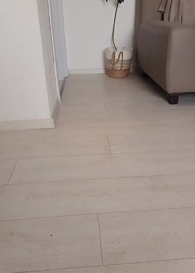 interior of a room. The camera is pointed at a light wood-look floor. In the background, there is a white wall with a potted plant and a tan colored couch. A person claps, and a small tan dog runs toward the camera. The dog comes so close that the camera is obscured.
