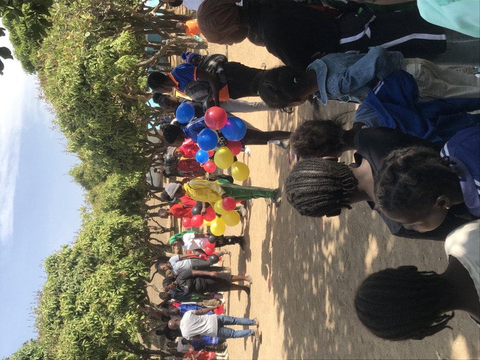 The image depicts an outdoor gathering in Jos, Nigeria, comprising approximately 30 to 40 individuals, primarily adults and children. The scene unfolds on a bare earth ground under the canopy of numerous large, green-leafed trees, consistent with mango trees, beneath a clear blue sky. Strong sunlight casts distinct shadows on the ground. In the immediate foreground, several children are observed from behind, facing into the gathering. One child is visible with braided hair, and another wears a light blue denim jacket. The midground features a diverse group of individuals holding clusters of balloons in red, yellow, blue, and black. A person in a yellow long-sleeved shirt and green track pants holds multiple red and yellow balloons. Adjacent, another individual in dark attire holds blue and red balloons; one blue balloon appears internally illuminated. An adult female is visible with an infant secured in a back carrier, also holding a blue balloon. Other adults and children are scattered throughout the midground and background, some wearing red, orange, or black attire. A light blue structure is partially visible in the background, behind the trees on the right side.