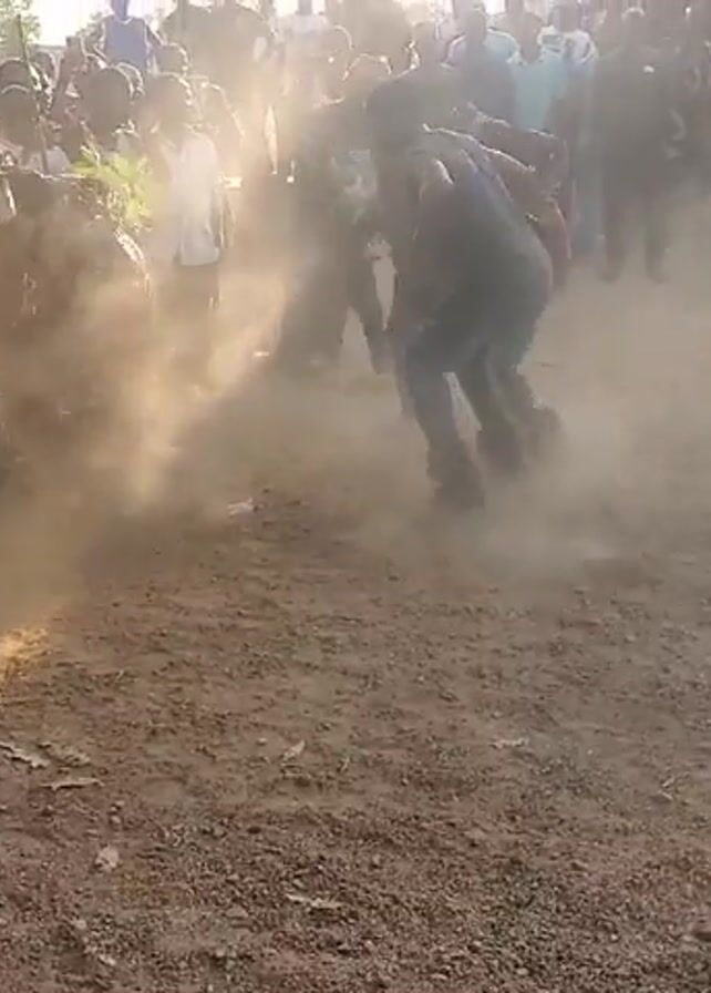 dusty area with a crowd of people surrounding a central point. Two people are seen moving around in the center, stirring up dust. One person on the left side of the frame is holding a phone up as if taking a video or picture. The environment appears to be an outdoor dirt or sand field with a building in the background. The overall mood is lively, with people gathered around what appears to be an event or performance. The scene is bright with sunlight, but the stirred-up dust obscures some details.