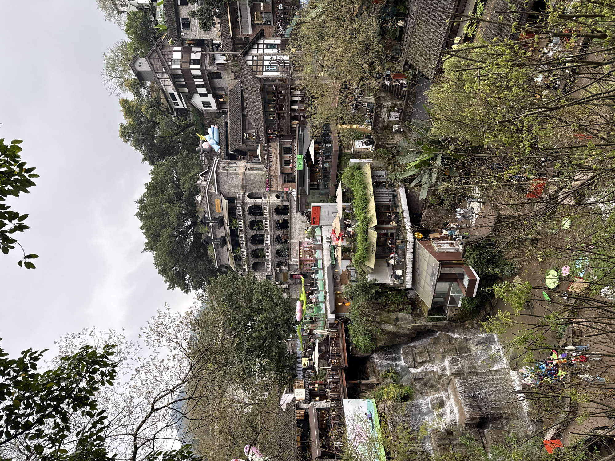 This image presents a multi-tiered, densely populated hillside complex in Nan'an District, China, viewed under an overcast sky. Numerous traditional Chinese-style buildings, characterized by grey brick facades, dark tiled roofs, and prominent wooden elements, are integrated into the terraced landscape. Many structures feature balconies and expansive outdoor patios, equipped with tables, chairs, and shade umbrellas, accommodating numerous individuals. A multi-tiered waterfall cascades down a rugged rock face on the left side of the frame, emptying into a narrow waterway or pond at its base. Lush green vegetation, including mature trees with varying leaf densities and dense undergrowth, is interspersed throughout the architecture and along the natural slopes. On the roof of a central building, a large, light blue inflatable figure resembling a reclining human-like character with a yellow object is prominently displayed. Numerous individuals are visible across the scene, primarily engaged in leisure activities. They are seated at outdoor tables, standing on balconies, or traversing staircases and pathways, suggesting patronage of various establishments such as restaurants or cafes. Colorful, decorative elements, possibly balloons or lanterns, float on the water near the waterfall's base. The overall impression is one of a vibrant, integrated urban and natural environment focused on public and social interaction.