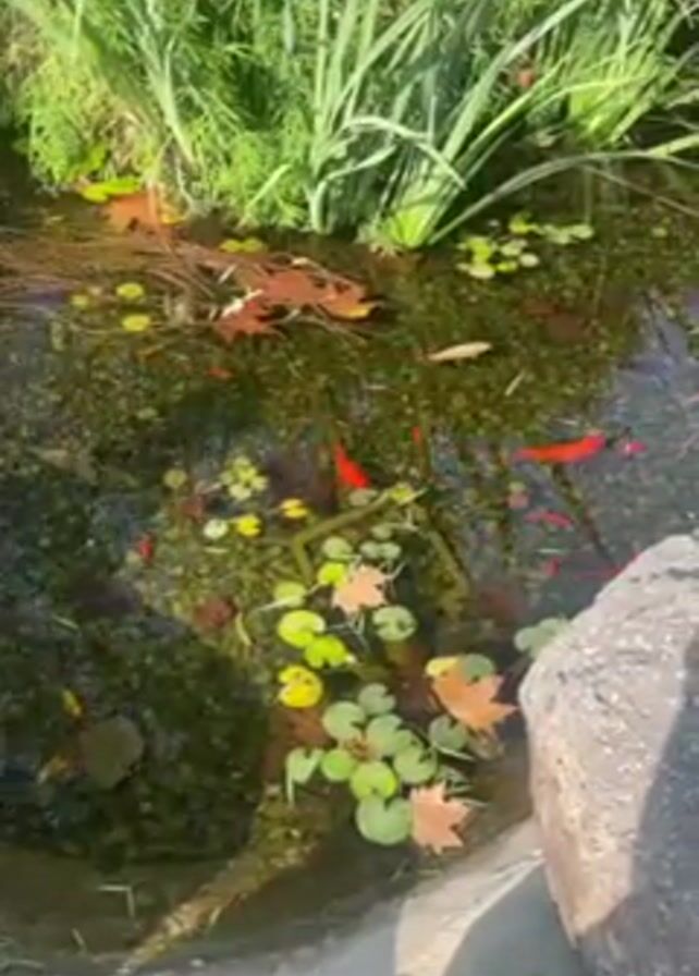 small pond with clear water, containing several red goldfish swimming around. The pond also has some lily pads and fallen autumn leaves on the surface. The edge of the pond is lined with rocks and green plants. The sun is shining, and the water reflects the light. Someone is speaking in the background but the words are unclear.