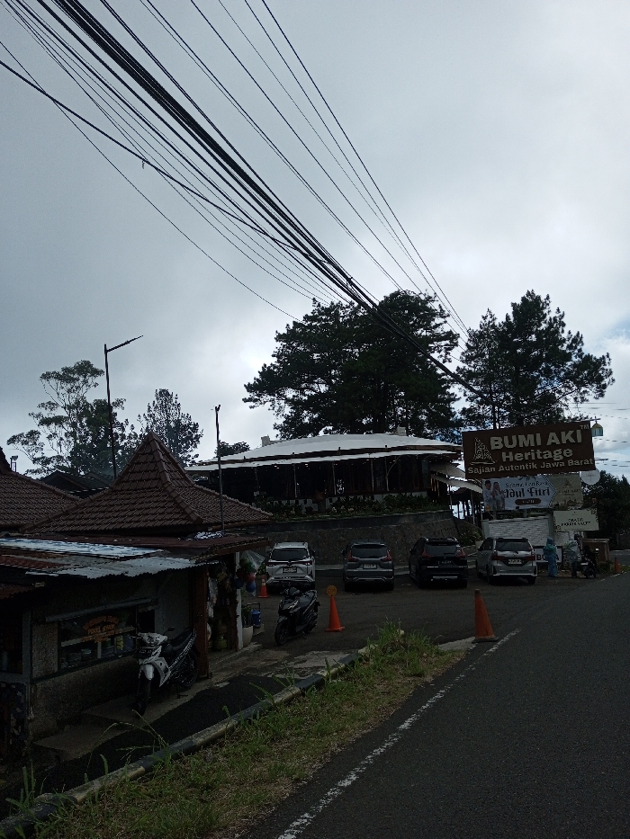 The image depicts an outdoor scene under an overcast sky, showing a roadside area with multiple buildings, vehicles, and people. A dense cluster of black electrical or communication wires spans the upper portion of the frame diagonally from left to right. In the foreground, a two-lane asphalt road with a solid white edge line runs across the bottom, with a grassy shoulder to its left. On the left side of the image, a single-story building with a multi-tiered, brown tiled roof and a corrugated metal awning functions as a small roadside shop, with merchandise visible inside. A white scooter and a black scooter are parked directly in front of this shop. Several individuals, indistinct in detail, are visible near the entrance of this shop. A dark street light pole stands to the left of this building. Further back and to the right, a larger, elevated building with a white-covered outdoor dining area is visible, surrounded by pine trees. This building is identified by a prominent brown sign that reads "BUMI AKI Heritage" at the top, with "Sajian Autentik Jawa Barat" (Authentic West Java Cuisine) below it, confirming the location as West Java, Indonesia. Below this main sign, another banner displays "Selamat Idul Fitri" (Happy Eid al-Fitr) and images of people. A parking area in front of this "BUMI AKI Heritage" building contains four parked cars: a white SUV, a dark grey SUV, a black SUV, and a silver SUV. A black scooter and two orange traffic cones are also present in this parking area. Two individuals, one wearing a blue head covering, are visible near the silver SUV. The background is dominated by dense pine trees and other foliage, with a cloudy, light grey sky overhead. No specific actions or interactions beyond human presence near the buildings and vehicles are discernible.