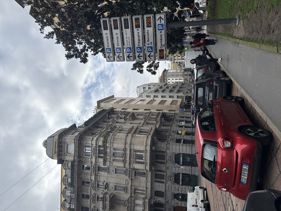 The image depicts a daytime urban street scene in Milan, Italy, under an overcast sky with patches of brighter cloud