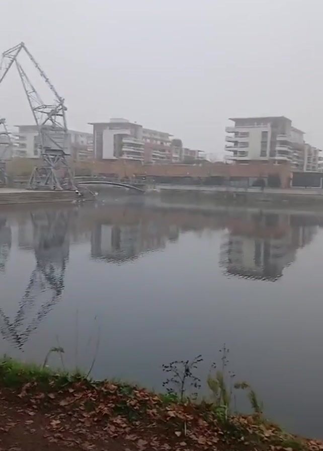 foggy day by a canal. Buildings line the canal, and their reflections are visible in the water. On the left side of the frame, two cranes stand on a concrete bank. The ground in the foreground is covered with fallen leaves and a small amount of green grass.