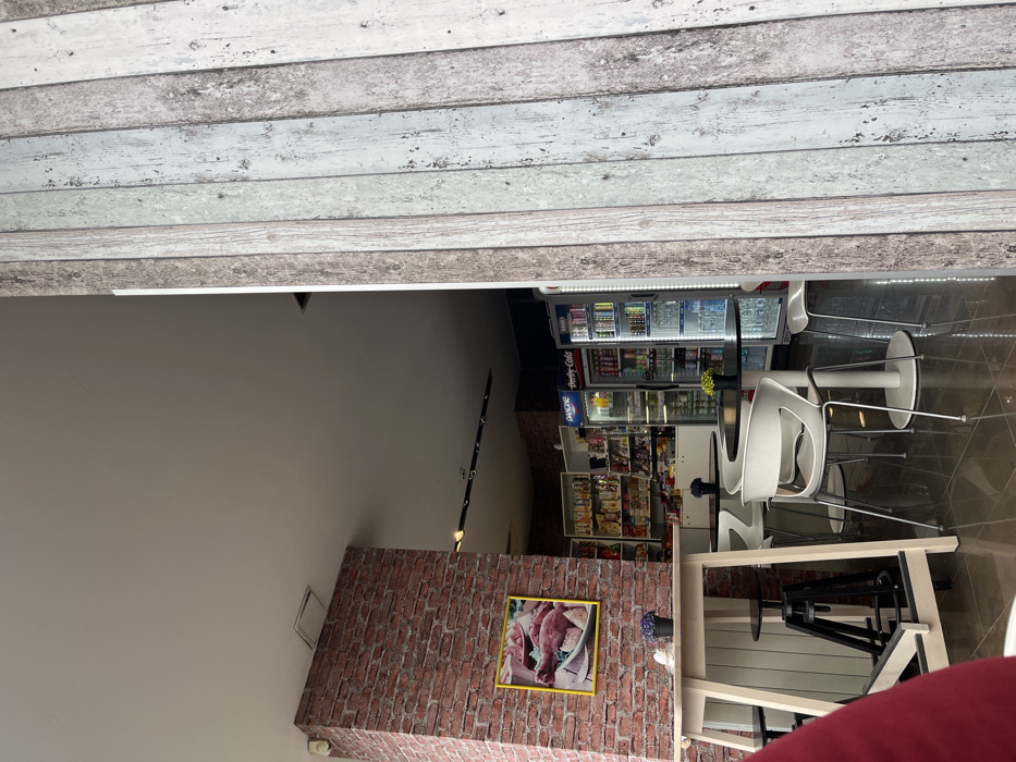 The image depicts the interior of a commercial establishment in Sofia, Bulgaria, likely a cafe or a small market with seating. The scene is observed from a low vantage point, with a person's maroon-colored left arm or shoulder visible in the lower-left foreground. To the left, a structural pillar covered in reddish-brown faux brick wallpaper stands prominently. Mounted high on this pillar is a small, light-colored surveillance camera. Below the camera, a yellow-framed picture displaying what appears to be raw poultry cuts on a white platter is affixed to the brick-patterned surface. A light-toned, high-top wooden table with a white base occupies the mid-left, featuring a small vase with purple flowers. A black, industrial-style stool with a tripod base is positioned beneath this table. The midground features several round tables with black tops and white central bases, surrounded by modern white chairs with metal legs. Small vases containing yellow flowers are visible on some of these tables. The floor is dark and reflective, suggesting a tiled or polished surface. The ceiling is light-colored and plain, with a track lighting system visible extending towards the background. In the background, a retail section is visible. Two large, vertical glass-fronted refrigerated display cases containing various bottled and canned beverages are present. One fridge displays "Danone," and another prominently features "Derby-Cola," a Bulgarian soft drink brand. Behind and to the left of these fridges, shelving units stocked with assorted packaged goods and snacks are visible. A vertical section of a wall or partition on the far right is covered in distressed, multi-colored (greys, blues, browns, whites) vertical wood panel wallpaper. No active interactions between individuals are discernible.