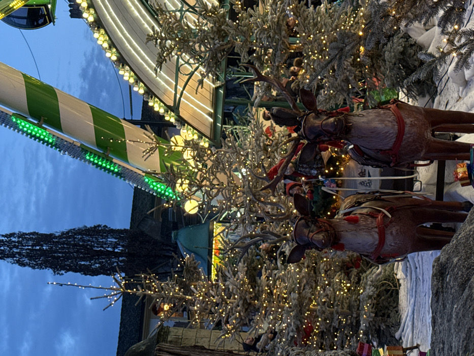 Two reindeer figures are adorned with harnesses and positioned near small, snowy Christmas trees with illuminated lights. A blurred green and white striped structure is visible in the background. The overall scene suggests a festive Christmas display or amusement park attraction at dusk. The sky in the upper left appears blue.