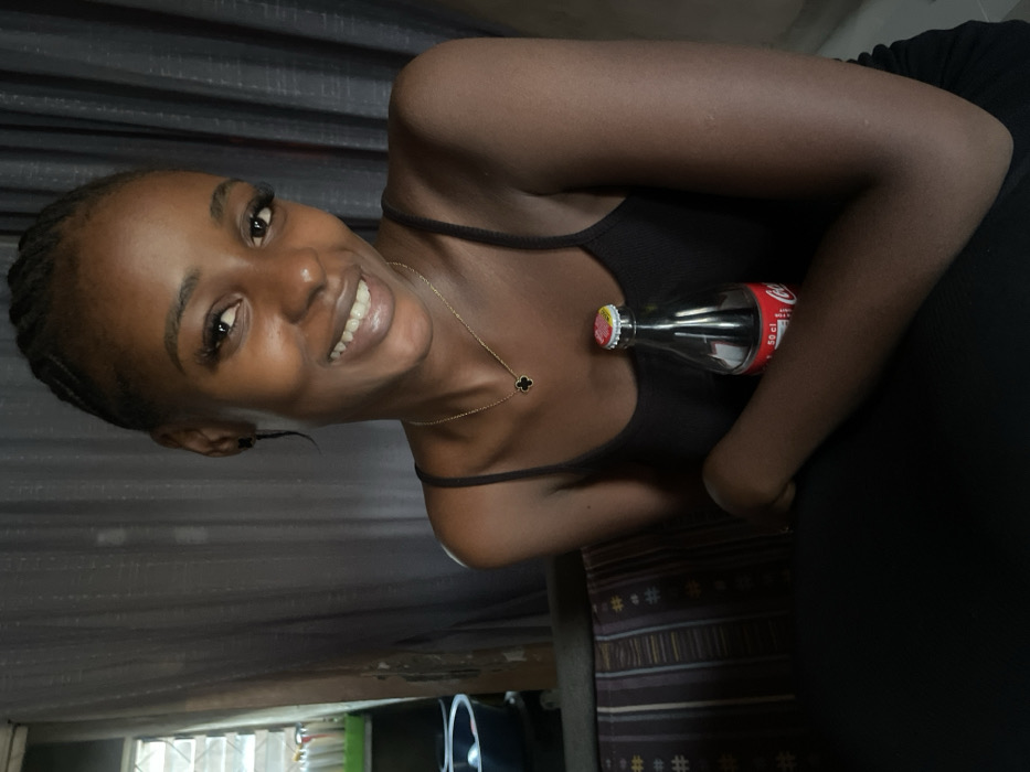A dark-skinned woman with braided hair smiles at the camera. She wears a black tank top and a delicate gold necklace with a black clover pendant. She's holding a small glass Coca-Cola bottle. The background includes a grey curtain, a patterned seat cushion, and a glimpse of a window with greenery outside.