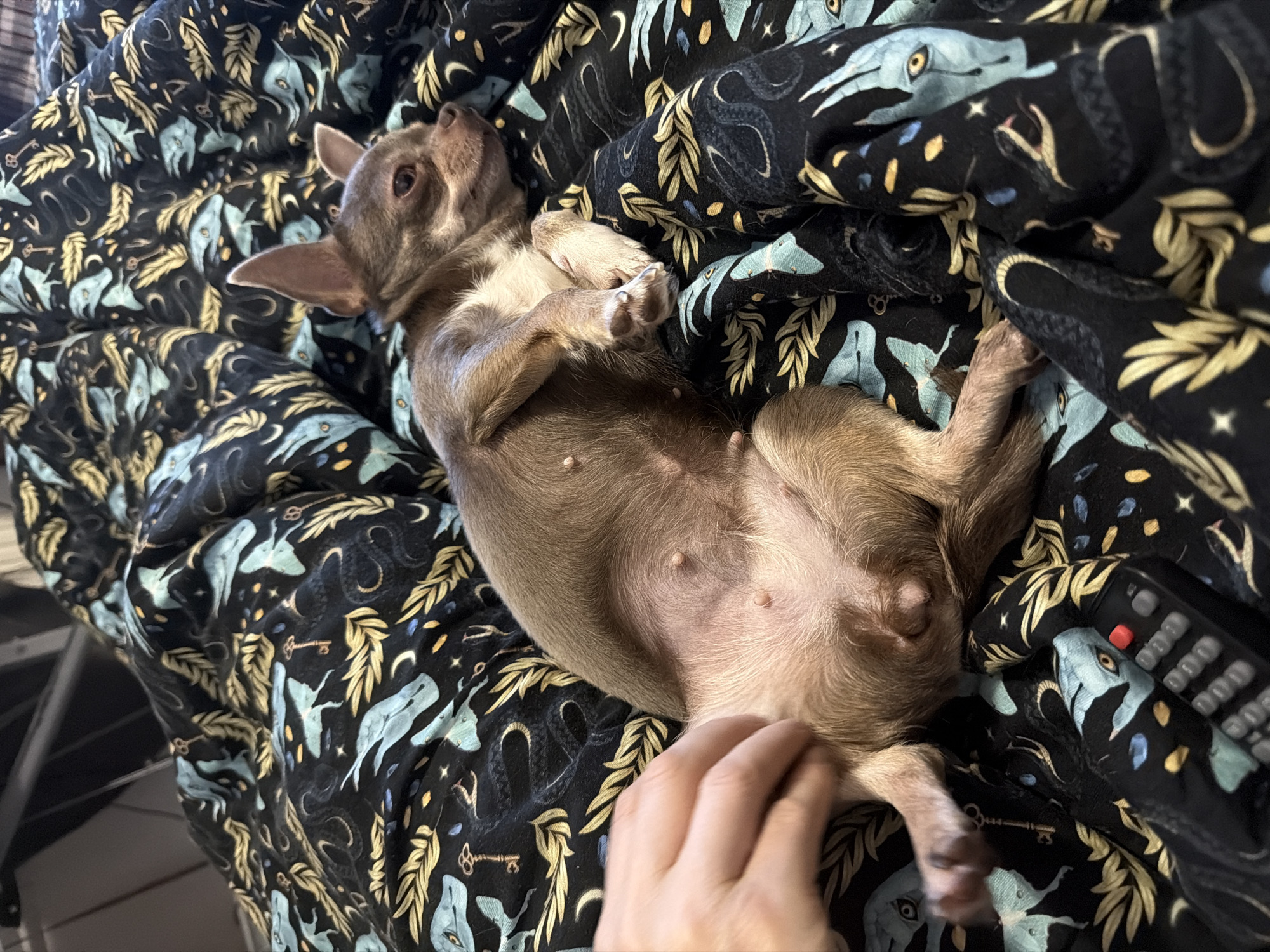 A tan chihuahua lies on its back on a dark-colored blanket with a pattern of keys, crescent moons, snakes, and moth-like winged creatures. A human hand strokes the dog's abdomen. A remote control lies to the right of the dog. The location and city cannot be determined from the given image.