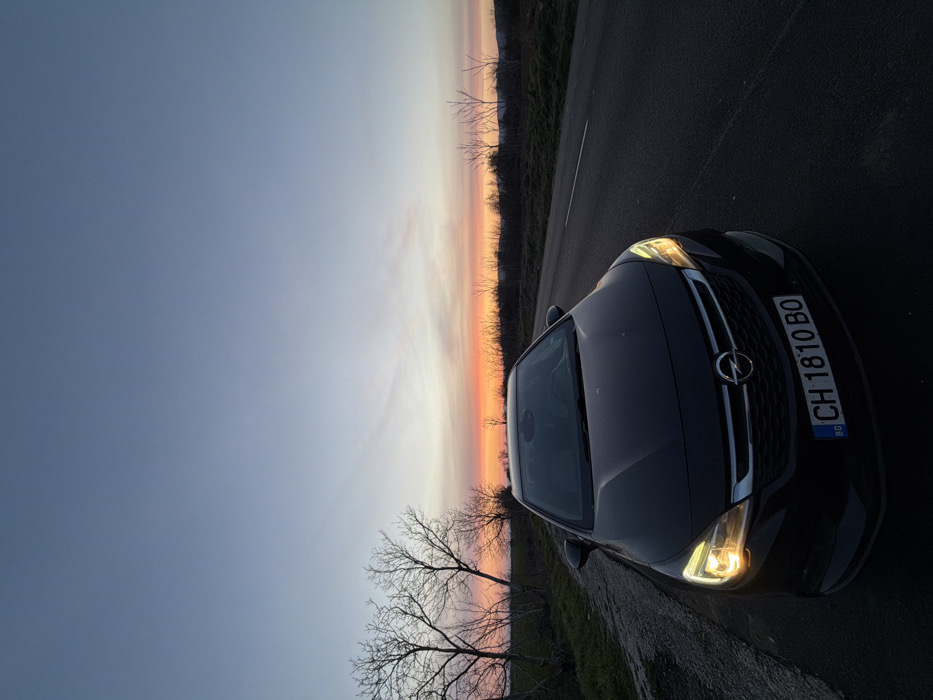 A black Opel Astra is parked on the unpaved shoulder of a two-lane asphalt road in Dalboki, Bulgaria, during either sunrise or sunset