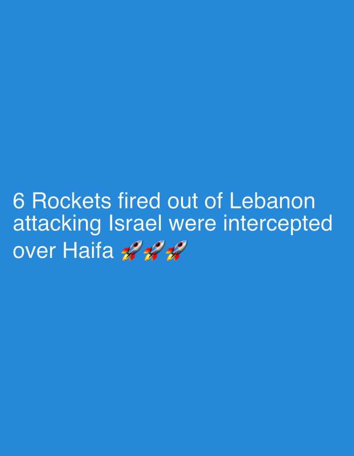 The image, observed from the context of Beit Yitshak Sha'ar Hefer, Israel, displays white text and three rocket emojis on a solid, untextured blue background. The primary subject is white sans-serif text positioned in the lower-left quadrant, stating: "6 Rockets fired out of Lebanon attacking Israel were intercepted over Haifa". Below the word "Haifa," three identical rocket emojis are horizontally aligned. Each rocket is depicted in silver with red and yellow fins, emitting orange and yellow flames from its thruster, and oriented to the left. No people, discernible objects, or environmental features are present beyond these textual and emoji elements. The image communicates information about an aerial event involving rockets over Haifa, Israel.