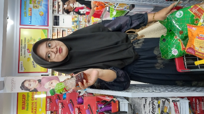 A person in a black hijab and glasses stands in a store aisle holding a small bottle