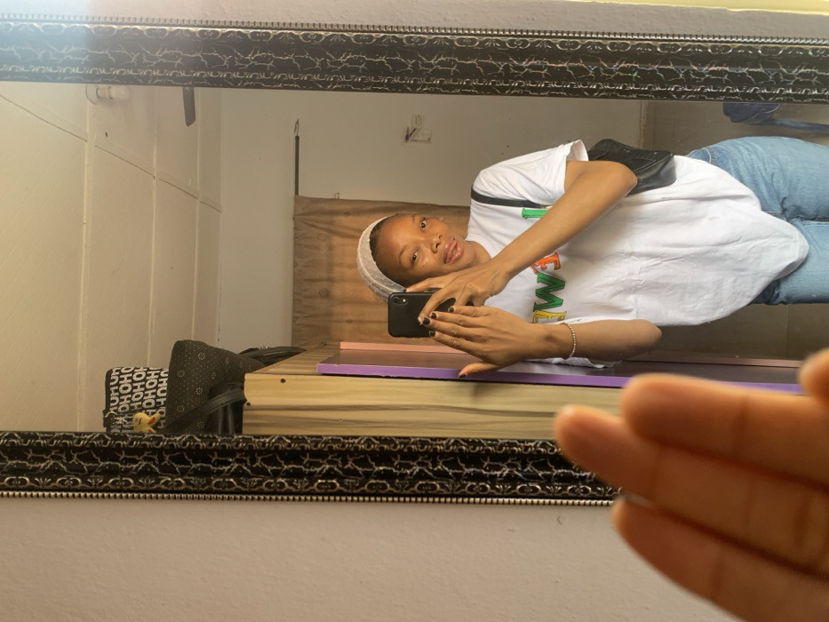 A female individual is depicted in a mirror selfie taken indoors in Ilorin, Nigeria