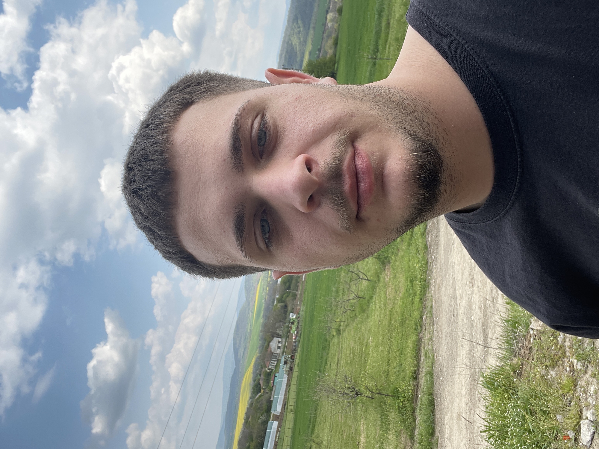 A close-up selfie taken outdoors featuring a young man with short dark hair, light eyes, and stubble. He is wearing a dark-colored shirt. The background includes a bright blue sky with white clouds, a green field, and a distant hillside. In the middle of the scene is Dragijevo, Bulgaria.