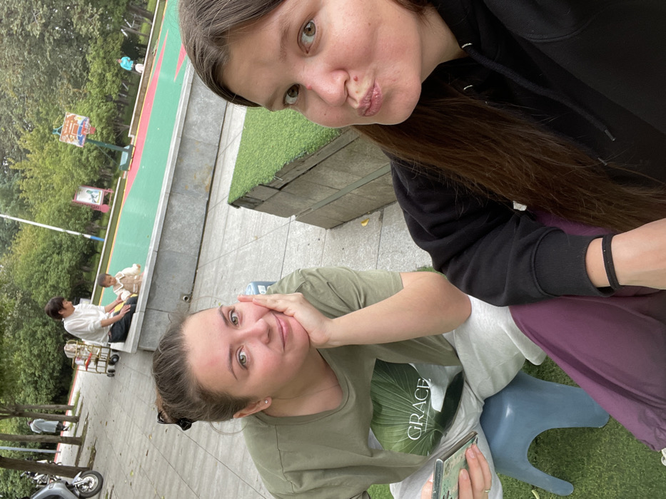 This image captures an outdoor scene in a park-like setting within Zhongyuan District, China. In the immediate foreground, two women are posing for a photograph. The woman on the left, with brown hair pulled back, is seated on a blue plastic stool. She wears an olive green short-sleeved t-shirt with a "GRACE" leaf graphic and light gray sweatpants. Her left hand rests under her chin, and she holds a light-colored smartphone in her right hand. The woman on the right, partially visible, has long dark brown hair and wears a black hooded sweatshirt and dark purple sweatpants. A black elastic band is on her left wrist. She is looking towards the camera with pursed lips. Behind the women, a low concrete wall topped with artificial green turf runs horizontally across the frame. Beyond this, a paved pathway is visible. On the left, a white scooter is parked, and a person in light attire walks past it. In the center and right midground, a multi-colored recreational court, predominantly green and red, features a small orange basketball hoop. A woman in a white shirt and dark pants is seated on the court's edge, observing a young child in a light brown outfit who stands nearby. Another individual in light blue is visible further back on the court. The background is filled with green trees under an overcast sky.