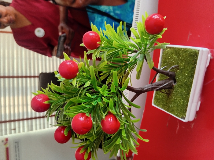 The image depicts an indoor scene, likely a professional office or medical facility, situated in Lokoja, Nigeria. In the foreground, an artificial decorative plant, resembling a small tree or bonsai, occupies the center. This plant features numerous vibrant green plastic leaves and eleven distinct, glossy red spherical elements, approximately 2-3 cm in diameter, simulating fruits or berries. It is contained within a white rectangular planter filled with artificial green grass and rests on a smooth, glossy red surface, identified as a desk or counter. In the mid-ground, behind the artificial plant, two individuals with dark complexions are partially visible. On the left, a woman is seen from the chest up, dressed in dark red scrubs that include a light-colored circular badge affixed to her left chest. She holds a dark, rectangular electronic device, possibly a mobile phone, with both hands, her gaze directed downwards. To her right, only the top of another individual's head and a portion of their shoulder are visible; this person is wearing a garment with a blue and black patterned design. The background shows horizontal blinds covering a window. A segment of a white vertical partition is discernible on the far left. Between the two individuals, a dark office chair backrest is partially visible. Below the right individual's shoulder, a white object with vertical slats, possibly an air vent or part of an office appliance, is also present. The precise street-level location within Lokoja is not discernible from the provided image.