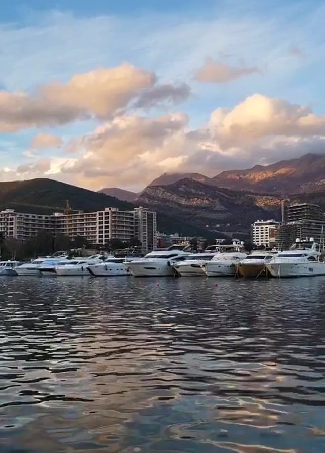marina filled with docked yachts, seen from the water level. In the background, a row of modern buildings lines the shore, with mountains rising further back under a partially cloudy sky. The water is rippling, reflecting the colors of the sky and the buildings. There are no people visible in the frame.