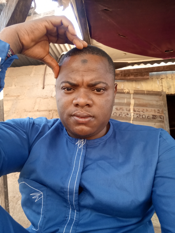 An adult male with dark complexion and short dark hair is depicted in a medium close-up, looking directly at the camera with a neutral expression. He has a distinct dark circular mark on his forehead. His right hand is raised, with the index finger and thumb touching the top right side of his forehead. He is wearing a blue long-sleeved top with a band collar, featuring white vertical embroidery along the front placket and a stylized white outline design on the left chest area, possibly a pocket. The background indicates an outdoor or semi-sheltered urban setting within Akwanga, Nigeria. To the left, a light-colored, rough-hewn brick or concrete block wall is visible. Overhead, corrugated metal roofing is partially visible, supported by wooden beams, and a dark red fabric canopy extends from the upper right. To the right, a weathered wooden structure, resembling a door frame, is present, with indistinct white markings or numbers on a surface behind it. The scene is illuminated by bright overhead daylight.