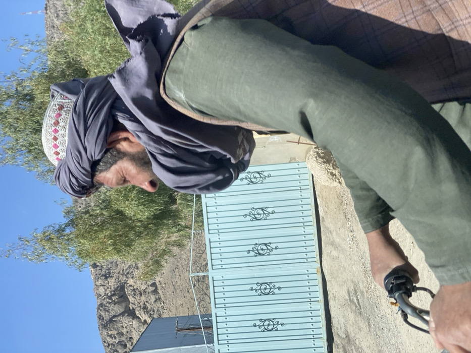 An adult male is depicted in a right-profile, mid-shot, operating what appears to be a motorcycle or bicycle, with his hands gripping the handlebars. He wears a dark green long-sleeved garment, a brown plaid vest, a white skullcap with pink embroidery, and a dark grey turban. The scene is located in Qazi Kariz, Afghanistan. Behind the man, a light blue metal gate with black decorative scrollwork stands. To the left of the gate, a section of a light blue building with vertical paneling is visible. Further in the background are green trees and rugged, light-colored mountains under a clear blue sky. The immediate foreground consists of dry, unpaved earth.