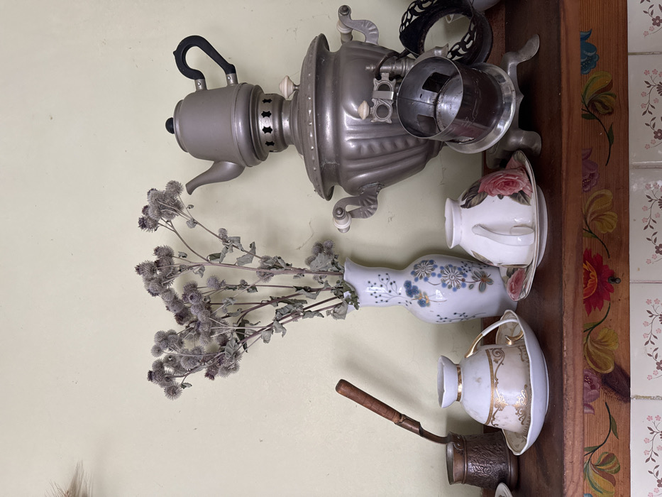 The scene captures a static arrangement of domestic items displayed on a decorated wooden shelf against a plain, light-colored wall in Капцёўскі сельскі Савет, Belarus. From left to right, a small, dark metal Turk/cezve with an upright wooden handle and embossed patterns stands beside an inverted white porcelain teacup featuring intricate gold scrollwork, resting on its matching saucer. Centrally located is a white ceramic vase with blue and yellow floral designs, containing a bouquet of dried thistle-like plants with numerous greyish-purple, spiky seed heads. To the right of the vase, another inverted white porcelain teacup with pink rose and green leaf motifs rests on its corresponding saucer. Dominating the right side is a large, silver-toned metal samovar, topped by a smaller grey metal kettle with a black handle. A silver-toned metal podstakannik (glass holder) is positioned inverted near the samovar's base. The wooden shelf below the items exhibits a painted folk art pattern of colorful flowers and leaves, with white patterned tiles partially visible beneath it. No individuals are present.
