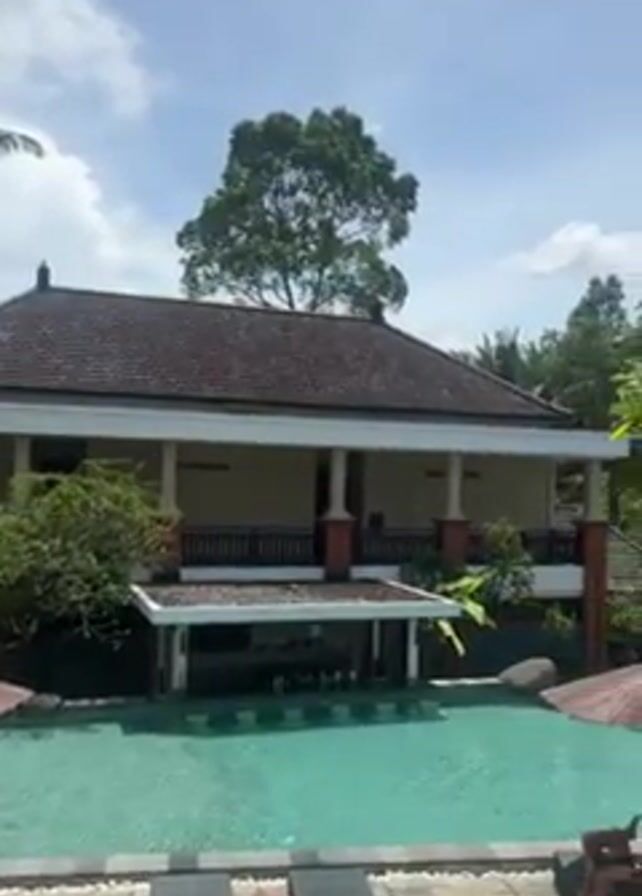 tropical swimming pool scene, likely at a resort. The pool is surrounded by lounge chairs, some occupied by people relaxing. There's a building with a traditional tiled roof overlooking the pool, featuring columns and a balcony with dark railings. Lush green foliage, including palm trees and other tropical plants, frames the scene, suggesting a warm, sunny climate. The sky is partly cloudy.